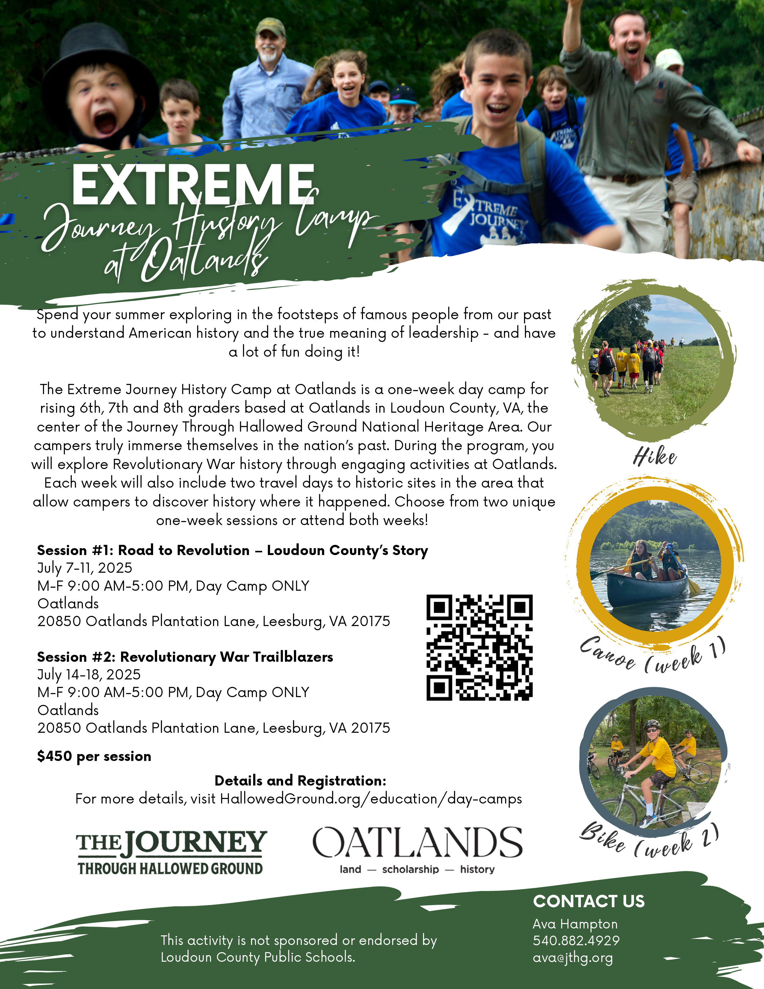 The Extreme Journey History Camp at Oatlands is a one-week day camp for rising 6th, 7th, and 7th graders. The first camp is The Road to Revolution – Loudoun County’s Story, held July 7-11. The second camp is Revolutionary War Trailblazers, held July 14-18. For more information and registration, visit The Journey Through Hallowed Ground website.